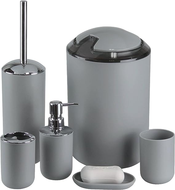 - ✔️【THE SET INCLUDES】: 1 Mouthwash cup, 1 Toothbrush holder, 1 Lotion dispenser, 1 Soap dish, 1 Trash can and 1 Toilet brush with bracket.
