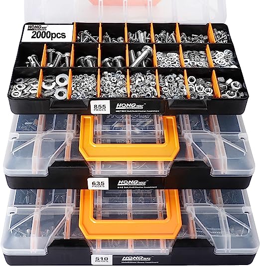 đź› Perfect Hardware Kit: This kit contains 2000 pieces of hardware in total, including bolts, nuts, washers, and screws. There are totally 64 standards: 855 pieces of SAE standard in 21 sizes, including Phillips#slot head bolts, nuts, and washers; 635 pieces of metric standard in 22 sizes, including Phillips#slot bolts, nuts, and washers; 510 pieces screws in 21 sizes, including wood screws and sheet metal screws.