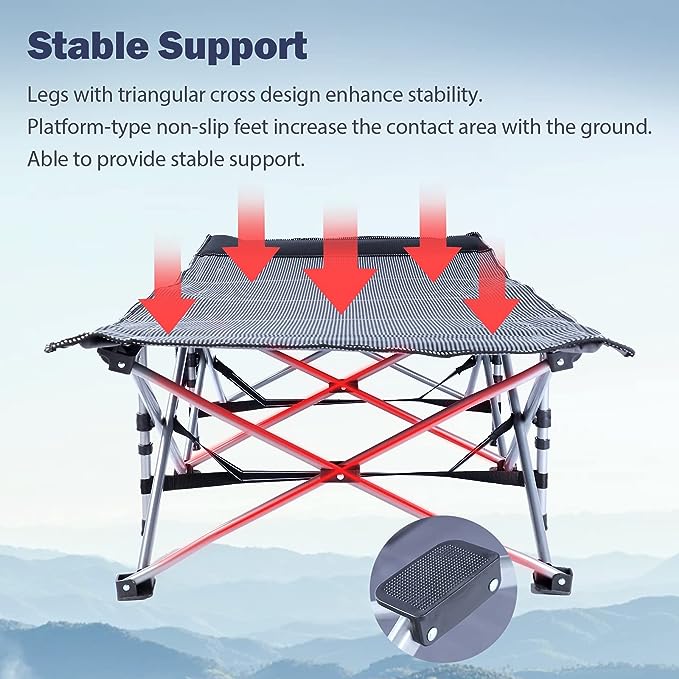 - Heavy Duty Cot: The camp cot is made of 1200D double-layer high-strength Oxford cloth. One inch thickened square tube and X-shaped structure leg with 10 Non-Slip foot support up to 900 lbs.